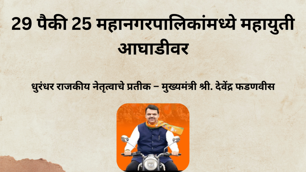 महाराष्ट्रातील 29 महानगरपालिकांच्या निवडणुकांचे अंतिम निकाल आणि अधिकृत ट्रेंड समोर आले असून, राज्याच्या शहरी राजकारणात महायुतीने (भाजप धुरंधर नेतृत्व असलेले मुख्यमंत्री श्री. देवेंद्र फडणवीस आणि एकनाथ शिंदे यांच्या नेतृत्वाखालील शिवसेना) मोठे वर्चस्व निर्माण केल्याचे चित्र स्पष्ट झाले आहे. सध्याच्या स्थितीनुसार 29 पैकी सुमारे 25 महानगरपालिकांमध्ये महायुती आघाडीवर किंवा सत्तास्थापनेसाठी निर्णायक बहुमताच्या स्थितीत आहे.